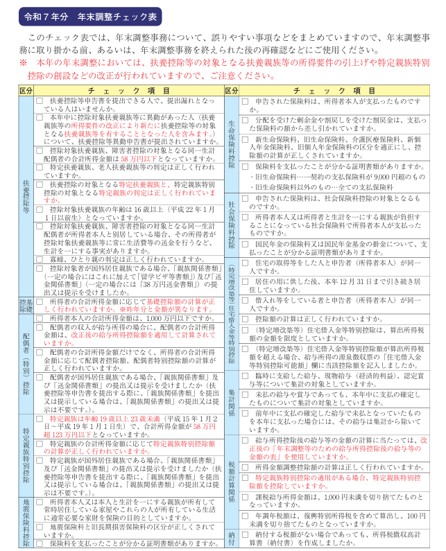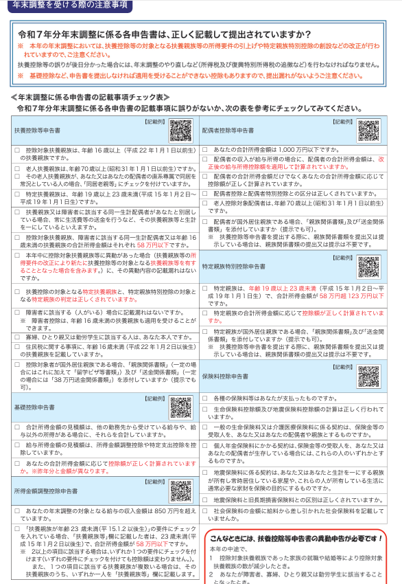 「年末調整に係る申告書の記載事項チェック表」と「令和7年分 年末調整チェック表」の2つを合わせて「年末調整関係チェック表」として書いてみました。