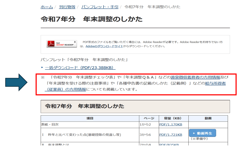 パンフレット「令和7年分年末調整のしかた」ではなく、「源泉徴収義務者の方用情報(会社側)」「給与所得者(従業員側)の方用情報」の2つをクリックします。