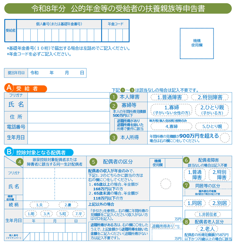 給与を受け取っている方が年末調整時に提出をする「扶養控除等申告書の年金バージョン」が扶養親族等申告書であり、配偶者や扶養親族を記入するところは同じです。