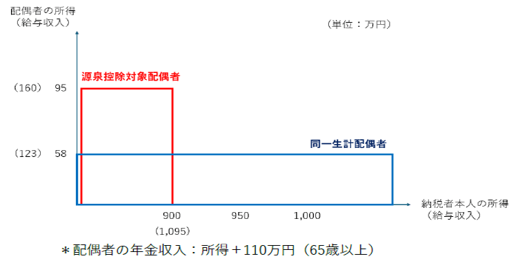 したがって、配偶者の所得はどちらも58万円以下となりますので本人の所得関係なく配偶者控除を受けられます。