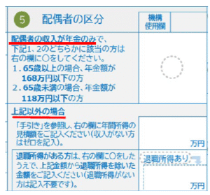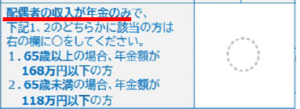 配偶者の収入が年金のみの方で、65歳以上は年金額が168万円以下、65歳未満は年金額が118万円以下なら〇をするとあります。