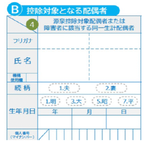 扶養親族等申告書のⒷ欄「控除対象となる配偶者」を見てみると、最初に「源泉控除対象配偶者または障害者に該当する同一生計配偶者」の氏名欄があります。