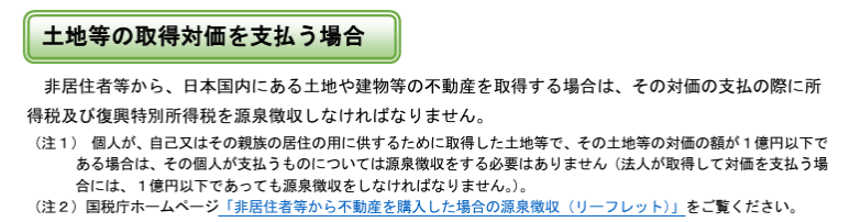 今回ご紹介するのは、非居住者から日本国内にある不動産を取得してその対価を払う場合です。