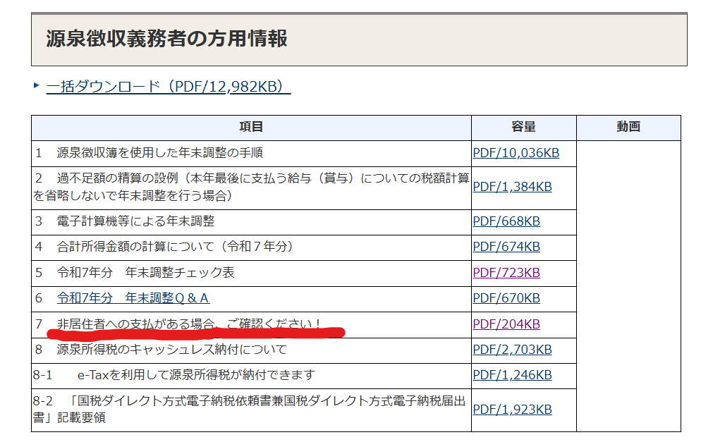 非居住者への支払いがある場合に確認をという案内は国税庁ホームページ年末調整のしかた「源泉徴収義務者の方用情報」に掲載されています。