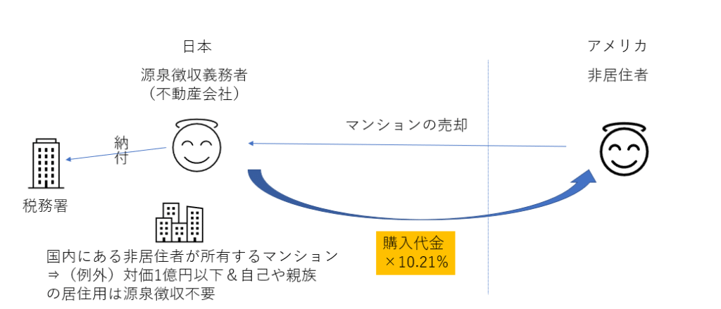日本の不動産会社はアメリカ人から日本にあるマンションを買う際に支払った金額の10.21%を源泉徴収して翌月10日までに税務署に納付しなければなりません。