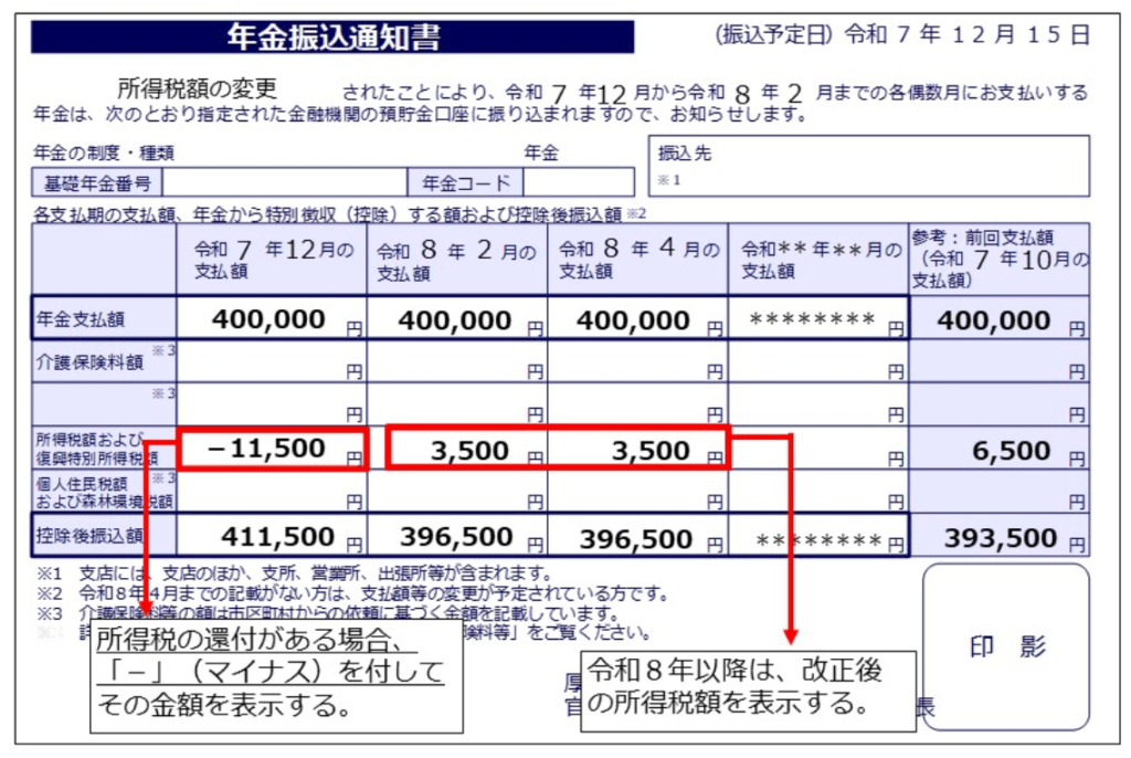 令和7年度税制改正により、令和7年12月振込時に所得税の還付があった方は還付後の額(新所得税額)となっていますので確認をしておきましょう。