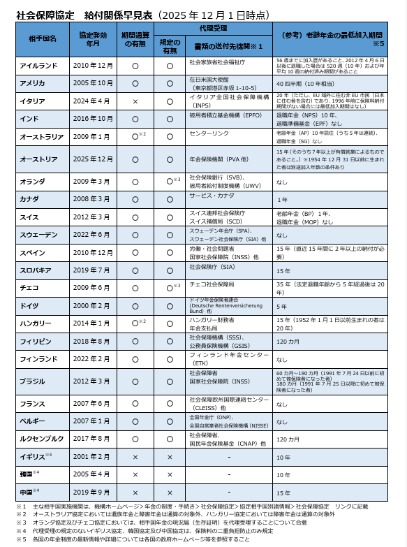 【事務所お知らせ】社会保障協定給付関係早見表(令和7年12月1日時点)