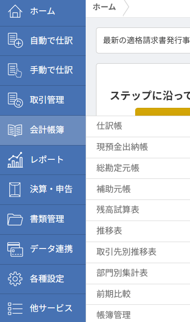 マネーフォワードでは、以下のように会計帳簿→残高試算表を選びます。
