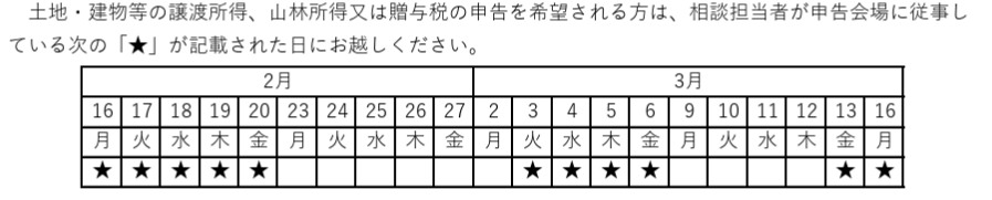 これはお住まいの税務署によったりするのですが、土地建物を売ったときの譲渡所得の申告や贈与税の申告については担当の職員がいない日があります。