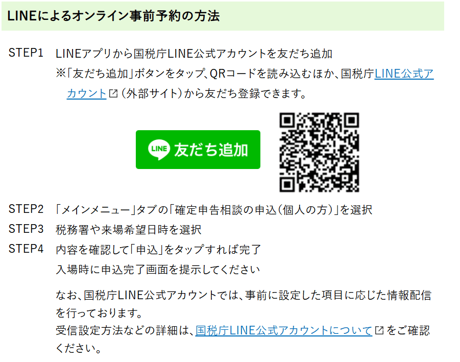 お住まいの税務署などで確定申告の相談をしたい場合には、「国税庁LINE公式アカウント」からオンライン事前予約の手続ができます。