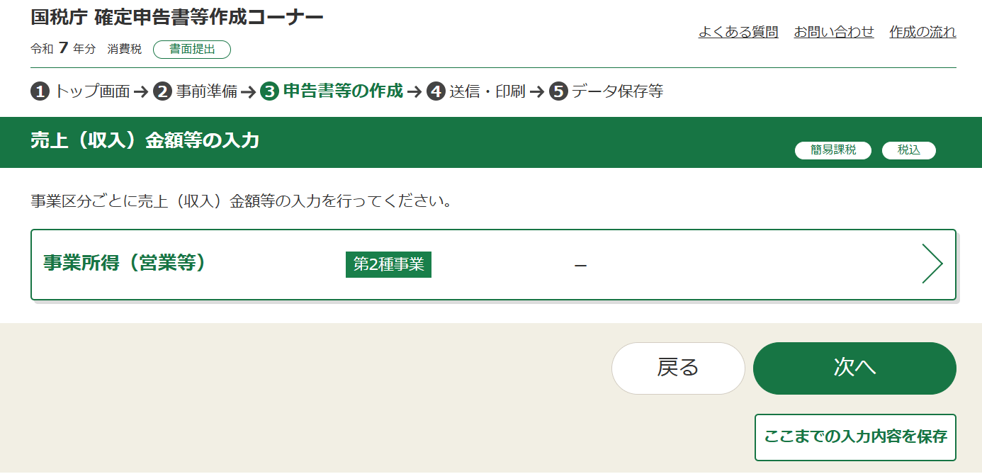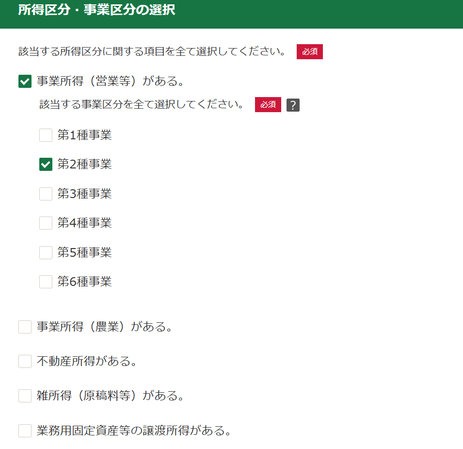 次に進みますと、所得区分・事業区分の選択画面が開きます。