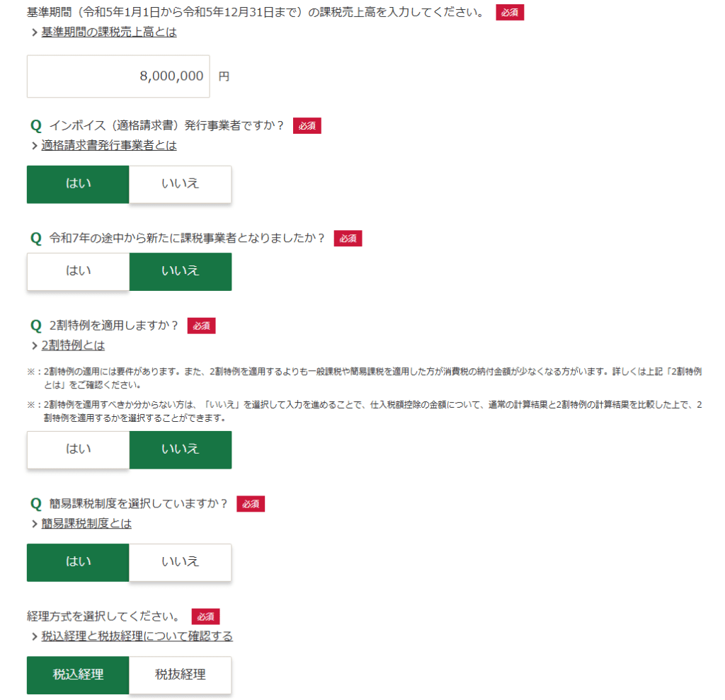 簡易課税が2割特例か判断できない場合でも、「2割特例を適用しますか?」で「いいえ」を選択すると有利か不利かを判定してもらえます。