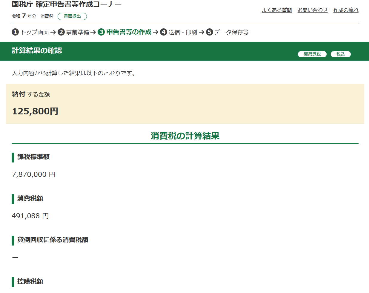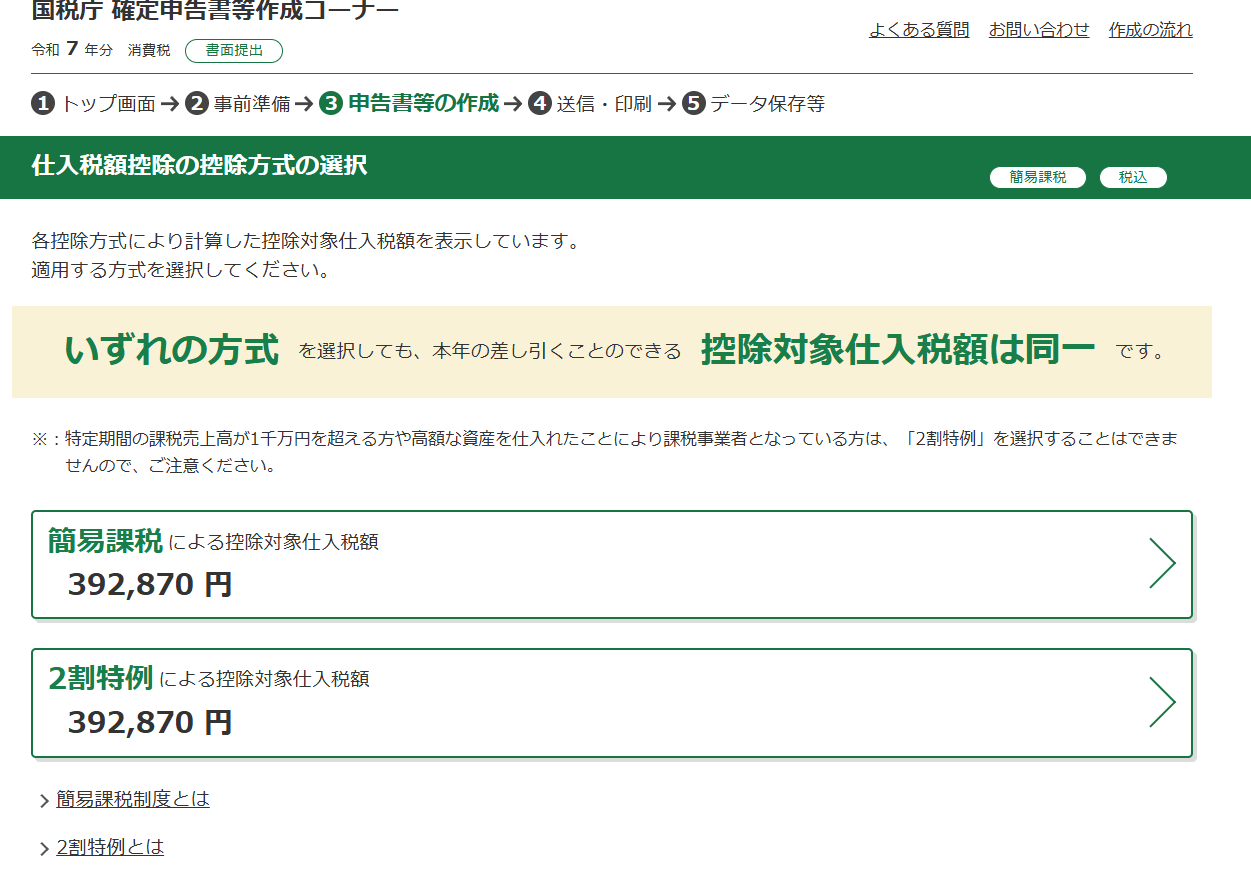 今回の場合は簡易課税と2割特例とも計算結果は同じなので、どちらの>を選んでもかまいません。
