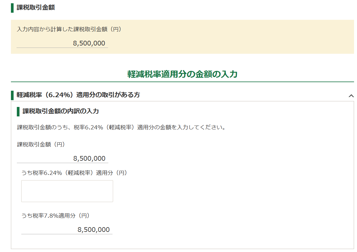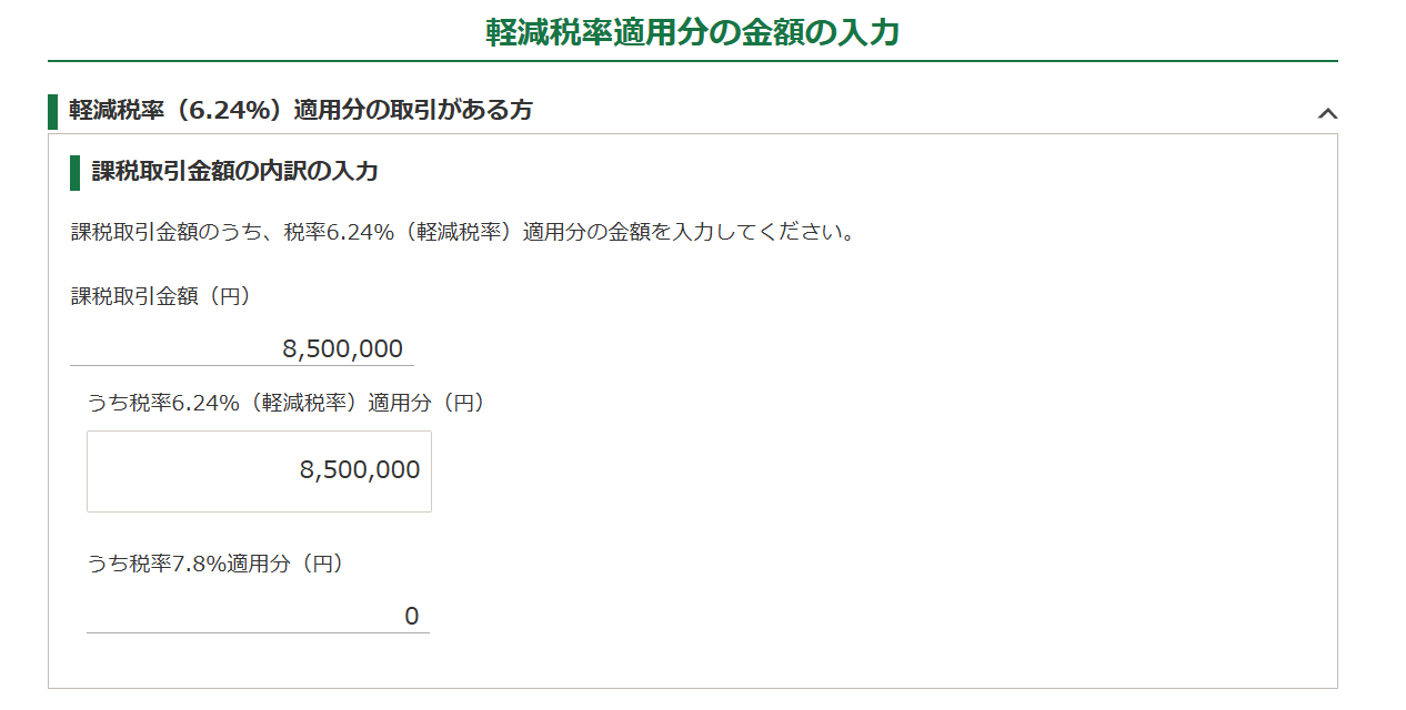 これを軽減税率8%(税率6.24%は税率8%のうち国税部分を指しています)適用分のほうに850万円を入力します。