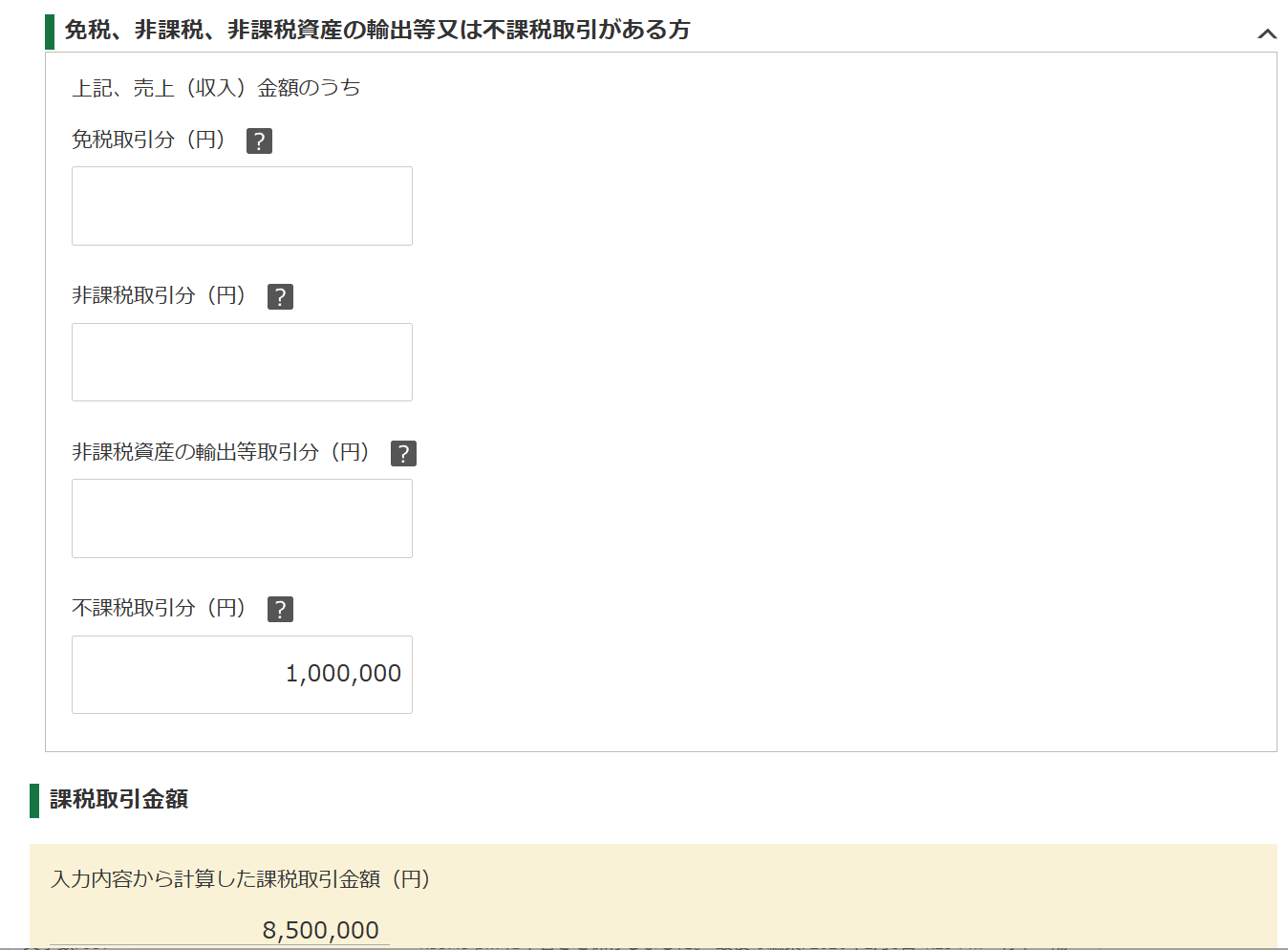 次に、「免税、非課税、非課税資産の輸出等または不課税取引がある方」の∨を開き不課税取引の欄に雑収入100万円を入力します。