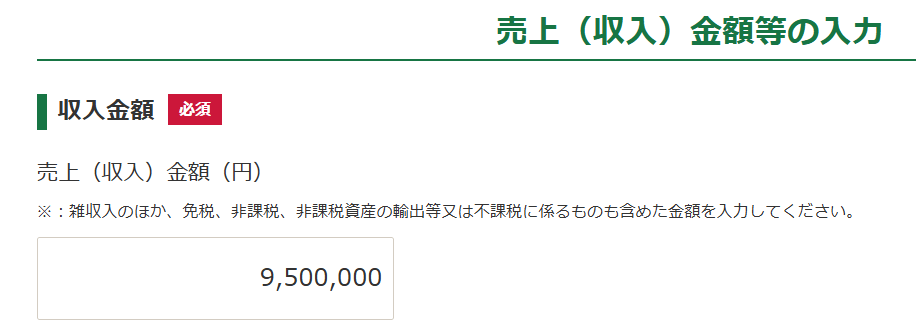 売上(収入)金額に入力するのは、売上のほか雑収入も含めた金額となります。