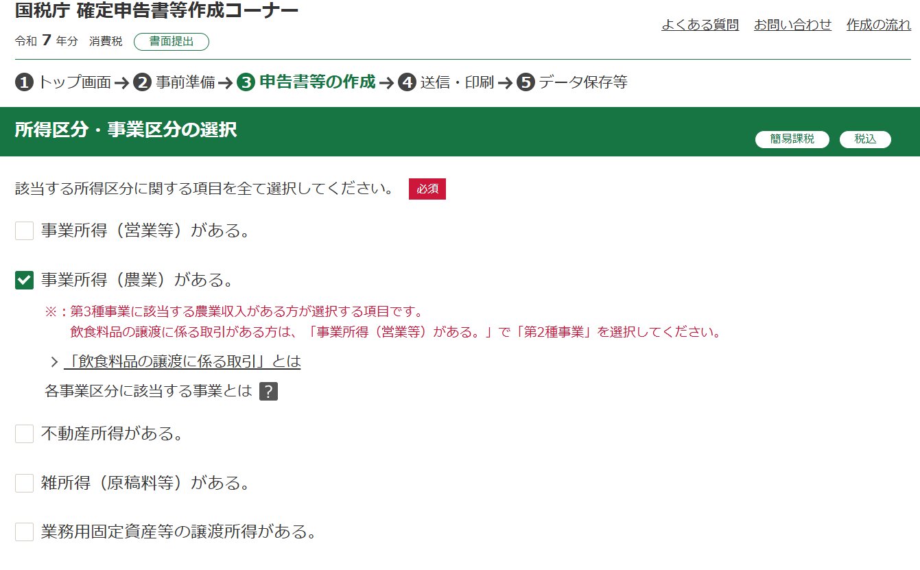 事業所得(農業)を選ぶと注意メッセージが出てきます。