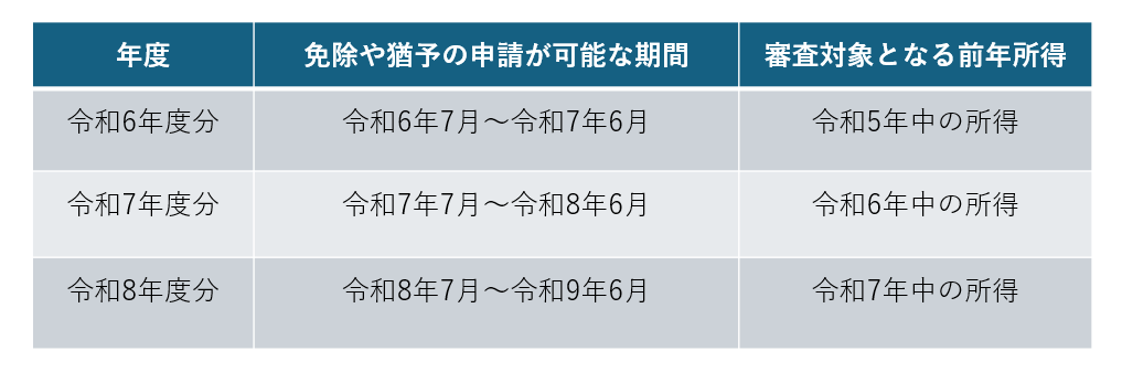 • 7月〜翌年6月分の免除申請:前年1月〜12月の所得