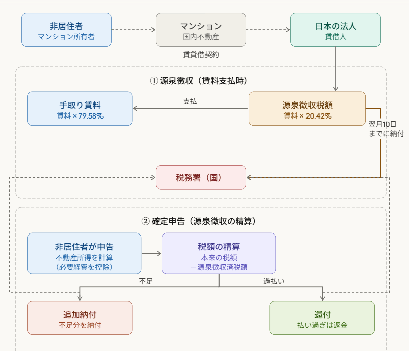 一方、Aさんが日本にあるマンションを貸し付けて得た賃料収入は国内源泉所得(不動産所得)となりますので所得税の確定申告が必要です。