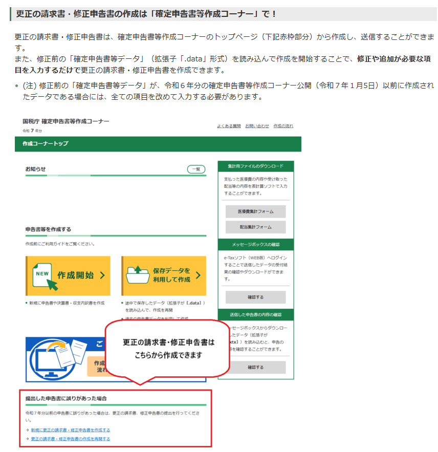 修正申告は国税庁ホームページにある「確定申告書等作成コーナー」から作ることもできます。